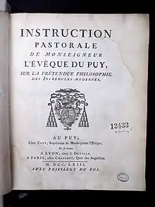 ![]() The Pastoral Instruction from Lefranc de Pompignan, published by Clet in 1763, was "highly respected" according to Bachaumont but mocked by Voltaire in Letter to a quaker (Fac 4610(1) BM Toulouse) | |