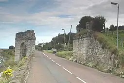 In February 1967 there was a major fall of rock onto the road south of Glenarm, and in May 1967 there was another which completely blocked the road.[5] At this point the cliffs are about 330 feet (101 m) high so Antrim County Council decided to build a new road 100 feet (30 m) on the seaward side of the old one. The Council did the work largely by direct labour and started to acquire the plant and equipment needed for the job. The council opened a quarry and began to build a new embankment, but on the night of 31 October 1968 there was a one in 70-year storm that washed away the part of the causeway that had not yet been protected by rock armour. The work resumed in 1969 and a reinforced concrete sea wall was built, again by direct labour. Altogether 97,000 tonnes of rock armour were placed and the scheme was completed in November 1970, over three years after the road was closed.[6]