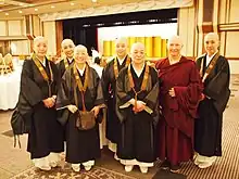 Rōshi has appeared on national television, in popular magazines, and at international conferences. In 2004 she attended the 8th Sakyadhita International Conference on Buddhist Women held in Seoul Korea, visited the tomb of St. Benedict in Italy, and had a private audience with Pope John Paul II. In April and May 2022, Aoyama Rōshi lectured in France at the Temple of La Gendronnière in Valaire on the topic of "Dôgen's vision on Zen practice." In 2008 she was the keynote speaker at the 10th Sakyadhita, held in Ulaanbaatar, Mongolia, where she spoke about Buddhism in transition.[16][3][17] Yusho Sasaaki Rōshi, a former student, has been chosen as the first Soto Zen female bishop of Europe. Another student, Yuko Wakayama Yamada, has been invited to teach monks on Dogen at Eiheiji.[18]