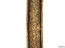 This photo is made of a single goat hair from a textile found on the 14th century ship in Tallinn, Estonia. Photo was done in archaeology department (University of Tartu) by microscope Olympus BX51, magnification 200x