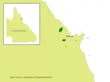 A. curtum is restricted to a small area of the Wet Tropics of Queensland between Kuranda and Edmonton near Cairns.[4][5] There are 5, possibly 6, populations in that area (one that was previously reported has not been relocated since).[5] It is found in open forest and on the margins of streams in complex notophyll rainforest, usually on granitic alluvial soils.[4][5] The altitudinal range is between 120 and 630 m (390 and 2,070 ft).[4][5]