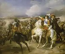 Another obstacle to the centralization of power was religious division in France. The Huguenots, one of the largest political and religious factions in the country, controlled a significant military force, and were in rebellion.[42] Moreover, Charles I, the king of England, declared war on France in an attempt to aid the Huguenot faction. In 1627, Richelieu ordered the army to besiege the Huguenot stronghold of La Rochelle; the cardinal personally commanded the besieging troops.[43] English troops under the Duke of Buckingham led an expedition to help the citizens of La Rochelle, but failed abysmally. The city, however, remained firm for over a year before capitulating in 1628.