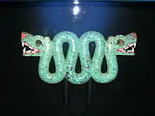 Non-ceramic sculpture in Mesoamerica began with the modification of animal bones, with the oldest known piece being an animal skull from Tequixquiac that dates between 10,000 and 8,000 BCE.[10] Most Mesoamerican sculpture is of stone; while relief work on buildings is the most dominant, freestanding sculpture was done as well. Freestanding three-dimensional stone sculpture began with the Olmecs, with the most famous example being the giant Olmec stone heads. This disappeared for the rest of the Mesoamerican period in favor of relief work until the late post-Classic with the Aztecs.[18]