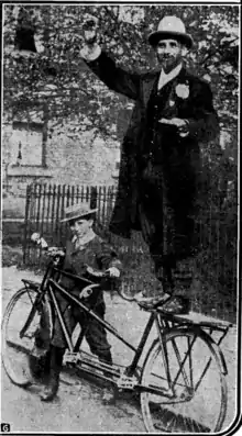 Living in Ilford, Hunnable worked as a bicycle and tool maker and motor engineer until March 1907.[3] He first came to public attention at the Jarrow by-election that summer, before which he spoke widely in the town, announcing that he intended to stand as a candidate.[4] He was nominated, but failed to deliver a £200 deposit, as required, and despite his protests, was not permitted to stand.[5] Despite this, he continued to give popular speeches, and the Mayor of Jarrow declared that "he keeps the young and the rough element amused".[6] Following the election, Hunnable appeared at the Empire Music Hall in Holborn in a skit reliving parts of his campaign.[7] After a week, he quit, to speak in the run-up to the Colne Valley by-election,[8] then moved on to the North West Staffordshire by-election. However, he did not attempt to stand, announcing that he had decided to stand at Jarrow in the next general election.[9] He proved less popular in Staffordshire, and was fined for causing an obstruction in Hanley Market Square, and describing any hecklers as "dirty little tykes".[10] Unable to pay the £3 demanded, he was imprisoned for a month,[11] but was released after three days, a public subscription having raised the sum.[12]