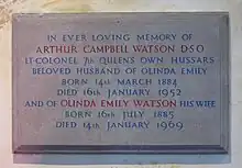 Watson was born in Newdigate, Surrey in 1884, and died in Shermanbury, Sussex in 1952. He was commissioned a second lieutenant in the 4th (Militia) Battalion, Essex Regiment, on 12 October 1901. Militia officers were part time, and he volunteered for active service with the Imperial Yeomanry serving in South Africa during the Second Boer War, joining the 33rd battalion as a lieutenant from 18 March 1902.[1] After his return to the United Kingdom, he transferred to the regular army where he was commissioned a second lieutenant in the 7th Queen's Own Hussars on 14 January 1903.[2] He later advanced to lieutenant colonel in this regiment, and was appointed a Companion of the Distinguished Service Order (DSO).