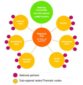 The Network has five Sub-Regional Nodes (SRNs) covering five sub-regions in Asia-Pacific. SRNs are organisations whose key functions are to lead the implementation of the sub-regional activities of the Network in collaboration with the RH and national implementing partners.[13] As of 2011, APAN's three Thematic Nodes (TNs) focused on water, agriculture and mountains to reflect priorities of the region and were composed of organizations with specific expertise on their respective thematic areas.[14]