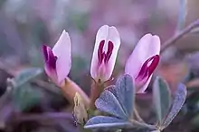 It is a perennial herbaceous plant,[1] with pinnate leaves 1.5–15 cm long with 3–15 leaflets, each leaflet 5–20 mm long. The flowers are pink-purple in color; flowering is between April and June. The fruit is a pod 13–28 mm long, containing a single seed.