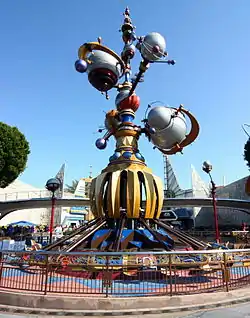 The Astro Orbiter is a "rocket-spinner", aerial carousel-type attraction featured at five Disneyland-style parks and Walt Disney Resorts around the world, except for Tokyo Disneyland. Although each ride may have a slightly different name, all share the same experience of vehicles traveling through space, spinning around a central monument. In most forms of the ride, the use of a joystick (or steering wheel, buttons, etc.) enables guests to adjust the height of their individual cars at will, usually within a range of no more than 10-15 feet. When the ride cycle comes to its completion, any ascended vehicles are automatically lowered for passenger exit and re-boarding. Over the years, with each new iteration of the ride debuting, new designs, thematic schemes, and locations have been implemented to fit with the changing themes of several Tomorrowlands.[2][3][4][5]