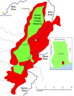 The Atewa Range Forest Reserve (also called the Atiwa-Atwaredu ranges) is in the Akyem Abuakwa region of southeastern Ghana, near the town of Kibi, and south-west of the Kwahu Plateau which forms the south-west boundary[1] of Lake Volta. The range runs roughly north–south, consisting of steep-sided hills with fairly flat summits.[2] It is the last remains of the Cenozoic peneplain that once covered southern Ghana,[3] and contains ancient bauxitic soils.[4] The range is the site of an important forest reserve, and the source of three major rivers.[5]