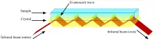 ATR uses a property of total internal reflection resulting in an evanescent wave. A beam of infrared light is passed through the ATR crystal in such a way that it reflects at least once off the internal surface in contact with the sample. This reflection forms the evanescent wave which extends into the sample. The penetration depth into the sample is typically between 0.5 and 2 micrometres, with the exact value determined by the wavelength of light, the angle of incidence and the indices of refraction for the ATR crystal and the medium being probed.[2] The number of reflections may be varied by varying the angle of incidence. The beam is then collected by a detector as it exits the crystal. Most modern infrared spectrometers can be converted to characterise samples via ATR by mounting the ATR accessory in the spectrometer's sample compartment. The accessibility, rapid sample turnaround and ease of use of ATR with Fourier transform infrared spectroscopy (FTIR) has led to substantial use by the scientific community.