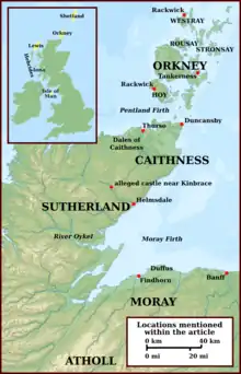 The saga states that some time later, Sveinn approached Earl Rögnvaldr, and asked the earl for men and ships to take vengeance upon Ölvir and Frakökk who were involved in the burning of his father. The earl consented to this request, and gave Sveinn two ships. Sveinn travelled south to Borgarfiörd, and then west to the trading place of Dúfeyrar. According to Anderson, Borgarfiörd may refer to the Moray Firth; and Dúfeyrar likely refers to the shore in the parish of Duffus, on the coast of Moray. The saga states that from Dúfeyrar, Sveinn travelled to Ekkialsbakki, and from there went to Atholl, where he met Earl Maddaðr.[30] Anderson stated that Ekkialsbakki, in this case, likely refers to the coast on the Moray Firth, next to Atholl;[31] The 19th-century historian William Forbes Skene agreed with this, specifically locating it to Findhorn, where ships could enter an estuary and follow a route into Atholl.[32] However, Hermann Pálsson and Paul Geoffrey Edwards, in their 1981 translation of the saga, identified the town of Banff with Dúfeyrar, and the River Oykel with Ekkialsbakki.[33]