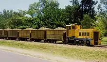 Queensland also has extensive sugar cane tramways of 2 ft (610 mm) gauge.[2] These cane tramways sometimes use second-hand standard-gauge shunting locomotives suitably regauged. The cane trams regularly haul over 500 tonnes of raw cane at a time, and because there are no continuous brakes, they may have a radio-controlled brake van coupled to the rear.