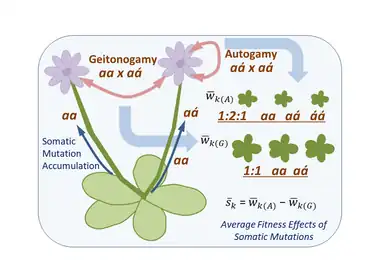 Autogamy depression can be defined as the "lowered viability of autogamous progeny relative to geitonogamous progeny".[1] Viability has also been evaluated in terms of percent fruit set or seed set rather than reproductive fitness of the progeny.[2] The experimental design for observing the occurrence of autogamy depression is called an "autogamy depression test" which has been described by researchers as analogous to a test for inbreeding depression.[1] The ability for fitness of autogamous progeny to differ from geitonogamous progeny comes from the understanding that plants can accumulate heritable mutational variation through both mitotic division and meiotic division.[3] Because plants have indeterminate growth, the apical meristems that contribute to the development of the reproductive structures of a plant have the potential to undergo continual mitosis resulting in the accumulation of somatic mutations (acquired mutations).[1] It has been demonstrated through research that long lived plants can have higher per generation mutation rate (based on occurrences of more mitotic cell divisions compared to short lived plants).[2] Any deleterious mutations that appear during mitotic growth are filtered out through cell lineage selection, in which deleterious mutations that are subject to developmental selection during mitotic growth are replaced by vigorous cell lineages, however, somatic mutations that are not expressed will not be subject to selection during growth of the plant and will accumulate in the apical meristem.[4]