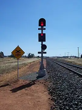 There are no speed signals in Western Australia's freight system operated by Brookfield Rail[25] and they are either Approach, Outer Home, Home, Departure and Starting signals.[26] Perth's urban passenger network is operated by the Public Transport Authority and the Rules are identical to that of the freight, with a few minor differences. One of them is the use of Station Limits boards similar to that used in Train Order territory.