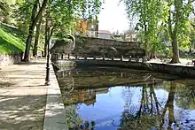 The geographer François Robert wrote in 1789 that the Bèze spring is one of the four most significant in France.[20] The spring is the most photographed place in Bèze. Some postcard publishers do not hesitate to improve the picture by scratching the glass plate negative for a more impressive outpouring.[15] The walk at the source around the spring is a monument historique site with construction dated to the 18th century and trees that are 200 to 300 years old.[21]
