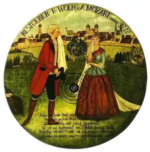 Schikaneder is known to history as the librettist and impresario of Mozart's opera The Magic Flute, written in 1791. In 1780, he had brought his theatrical trouple to Salzburg for an extended stay, and during this time befriended the Mozart family. He is recorded as participating in Bölzlschiessen with them, and the target that portrayed him was based on his reputation as a womanizer. According to Schroeder it shows him "trifling with one woman while another waits patiently for him to come to her."[10]