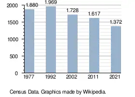 At the 2021 census, Băile Tușnad had a population of 1,372.[3] At the 2011 census, the population was 1,617; the town had a Székely Hungarian majority with 1,460 (90.3%) Hungarians, and small communities of ethnic Romanians (6.9%) and Romani (2.6%).