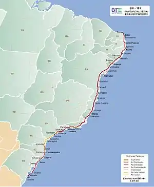 It crosses 12 Brazilian states: Rio Grande do Norte, Paraíba, Pernambuco, Alagoas, Sergipe, Bahia, Espírito Santo, Rio de Janeiro, São Paulo, Paraná, Santa Catarina and Rio Grande do Sul. It also connects more state capitals than any other "rodovia" (highway) in the country. In total, 12 capitals are directly connected by BR-101.