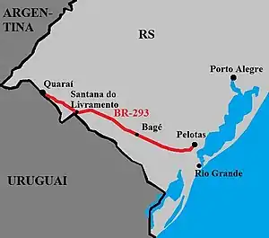 The BR-293 is an east-west highway in the state of Rio Grande do Sul, Brazil. The highway connects Pelotas to Quaraí, crossing important cities in the southern tip of Brazil such as Bagé and Santana do Livramento. The highway measures 535.7 km. [2]