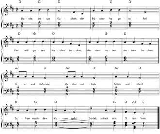 "Backe, backe Kuchen" is a German-language children's rhyme. The original was in Saxony and Thuringia with several textual versions from 1840.