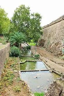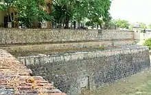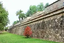 Curtain wall of the bastion, old defensive walls and, in the middle, the moat