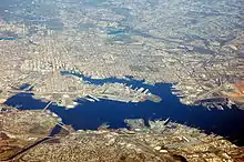 ![]() Cargo loading cranes at the Sea Girt and Dundalk Marine Terminals along the northeast shore of the Northwest Branch of the Patapsco River towards the Inner Harbor and downtown Baltimore | |