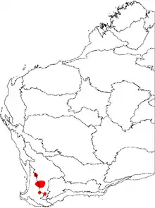It grows in sandy gravelly soils or sandy loam, in lateritic hills amongst Wandoo or Powderbark woodlands, between Toodyay and the Dryandra Woodland, and also west of Kojonup. Thus it occurs in the Avon Wheatbelt and Jarrah Forest regions of the Southwest Botanic Province.[5][11]