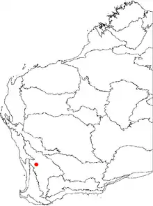Banksia wonganensis occurs only in the Wongan Hills and on surrounding rises,[1][2] in the Avon Wheatbelt biogeographic region.[6] The location has lateritic soils covered by open woodland or dense scrub. Mean annual rainfall is 350 to 400 millimetres (14 to 16 in), with a mean temperature range of 11.1 to 24.3 °C (52.0 to 75.7 °F), and up to 80 days above 30 °C (86 °F).[2]