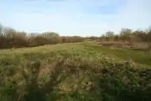 The Fosse Way Roman road descends into Batheaston via Bannerdown hill, before joining the London Road (A4), also a former Roman road.[10] The hill rises to 189 metres (620 ft) above sea level, and by the roadside on the top of the hill (grid reference ST796700) rest the Three Shire Stones – three vertical blocks of limestone with a large cap – which mark where the historical counties of Gloucestershire, Wiltshire and Somerset meet. The stones are formed in the style of a burial chamber, and inside are three small dressed stones (the original stones), each dated 1736 and bearing the initial of one of the three counties.[11] The previous Shire stones are shown on a John Speed map dated 1610. In 1859 a cromlech was erected over the top of the original stones, which possibly were part of a burial chamber. Local newspapers and national journals of the time report that three skeletons were found in the hole, along with a James II coin, during the work. Each stone is approximately 9–12 feet in height and weighs four to five tons, with the cap being of a similar size and weight. The work in 1859 was costed as £34 5s 8d; dinner to the workmen was included.[12]