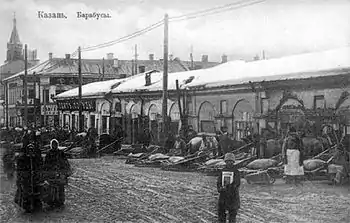 Barabus (rendering of Tatar barabız “we are going” + English bus) was a winter public transport in 19th – early 20th centuries, probably the first public transport in Kazan after cabs. They were operated by private carriers who were poor Tatar commoners from surrounding villages. A typical barabus was a sledge sheeted with sacking. Barabus was a transport of paupers competing with cabs, horse railways and later tramway. Until the 1930s, when trams were installed in the suburbs and any private enterprise was prohibited, barabuses were the only transport to connect quarters of poor mill-hands with other parts of the city.