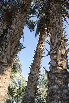 In order to multiply the number of fruit-bearing trees traditional offshoot propagation is practised all along the Nile in Sudan. Lower offshoots called Shatla (شتلا) develop from axillary buds at the lower trunk of a parent palm and are cut off during early spring season. A well chosen offshoot will not only guarantee a female fruit bearing palm tree but also inherit the same qualities of its mother plant.[5] The date trees in the region of the Fourth Cataract attain an age of up to 150 years and consist most often of multiple shoots from a single clump called Bu'rah or Hufrah (بؤرة or حفرة).[6] Satisfactory date production ceases with an age of 90 to 100 years. With increasing age and height the palm tree becomes more difficult to climb in order to be pollinated and harvested.