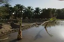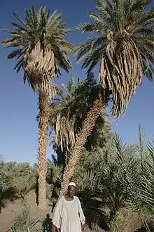 Date palm trees and Doum palms (Hyphaene thebaica) are perfectly adapted to the regional climate of Dar al-Manasir. They are drought resistant and can withstand the exceptionally hot dry and rainless summers and cold dry winters. The proximity of Ashu land to the river Nile makes the water table accessible to the deeply penetrating roots of fully grown palm trees throughout the year, making it the most valuable class of land.[4] Since dates constitute the most relevant cash crop in Dar al-Manasir their cultivation is not limited to Ashu land only, but expands along the irrigation channels of the Saqiah land. During recent years date trees even substitute seasonally irrigated crops such as wheat, beans and okra on the traditional Saqiah land.