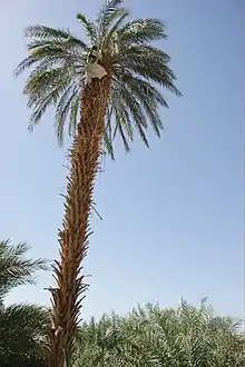 Pollination of the female fruits is conducted in late February and beginning of March which is, according to the Coptic calendar still used for agricultural purposes by the Manasir, the end of the month Amshir.[7] During this season the stout male spathes split and their inflorescences reach maturity. Fresh strands of flowers are carefully picked out of the male clusters and packaged to strands of two called Rabetah Qaru'ah (ربطة قرعة). The Manasir consider the variety of a potent male seedling irrelevant and pollinate all their female inflorescences from the same male tree. The process of pollination is called Qaffes (قفّز) and can be carried out by any person physically able to climb the palm tree. In each spathe of female inflorescence about 8-15 packages are tucked between the fruit bearing spikelets. An adult female palm produces around 15 to 25 spathes, each spathe containing 150 to 200 date bearing spikelets.[5]