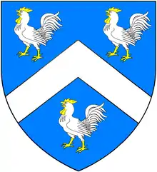 Arms of Lloyd of Dolobran, Montgomery, Wales (of which family were the Lloyd Quakers, bankers and steel manufacturers of Birmingham: Azure, a chevron between three cocks argent armed crested and wattled or[1]