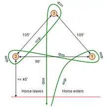 Standard barrel racing patterns require measured distances between the start line and the first barrel, from the first to the second barrel, and from the second to the third barrel.[6]