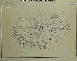 The Battle of Gamonal (also known, in Spanish, as the Battle of Burgos) was fought on 10 November 1808, during the Peninsular War in the village of Gamonal, near Burgos, Spain. A French army under Soult overwhelmed the outnumbered Spanish troops under General Belvedere,[2] opening central Spain, including Madrid, to invasion.[3]