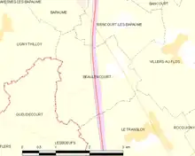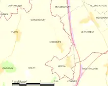 The Germans had built new defensive lines during the battle and the first two were called the Riegel I Stellung/Allainesstellung (Switch Trench I Position/Allaines Line), a double line of trenches and barbed-wire several miles further back, as a new second line of defence along the ridge north of the Ancre valley, from Essarts to Bucquoy, west of Achiet le Petit, Loupart Wood, south of Grévillers, west of Bapaume to Le Transloy and Sailly-Saillisel. On the reverse slope of that ridge, the Riegel II Stellung/Arminstellung (Switch Trench II Position/Armin Line) ran from Ablainzevelle to west of Logeast Wood, west of Achiet le Grand, the western outskirts of Bapaume, to Rocquigny, Le Mesnil en Arrousaise to Vaux Wood. Riegel III Stellung branched from Riegel II Stellung at Achiet le Grand and ran clockwise around Bapaume, then south to Beugny, Ytres, Nurlu and Templeux la Fosse.[16] The first two German reserve lines had various British titles (Loupart/Bapaume/le Transloy/Bihucourt lines) and the third line was known as the Beugny–Ytres Switch.[17]