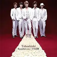 "Beautiful You / Sennen Koi Uta" (千年恋歌, lit. One Thousand Year Love Song) is Tohoshinki's 22nd Japanese single, released on April 23, 2008 shortly before the completion of the T album Japan tour. "Sennen Koi Uta" was used as the opening theme for "The Legend (太王四神記)", a Korean drama that was later aired in Japan. Oricon News predicted that the consecutive releases of the previous single albums as well as the popularity of the historical drama series were expected to boost the sales of the latest single.[1]