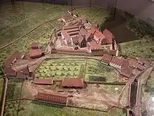 The Bebenhausen monastery complex is situated upon a terrace above the Goldersbach river within the Schönbuch nature park.[11] The existing buildings of the monastery were built from 1475 and 1500 upon older structures.[1] They are defended by a 13th-century wall, two towers, inner bailey, and a 15th-century gatehouse, the Writing Tower, found at the complex's southwest end.[28] The southeastern complex of buildings, constituted by the guest house, hospital, abbot's kitchen, and a courtyard, were transformed by Charles I into Bebenhausen Palace. Charles I had the rooms of the palace renovated in the Gothic and Renaissance Revival styles by August Beyer and furnished with items from the royal collection. William II and Charlotte made further alterations to the palace from 1891 to 1918 and extensively modernized it.[13] To the north of the royal retreat are the abbey's barns. To the south is the abbot's house, once connected to the rest of the monastery by a bridge.[28]