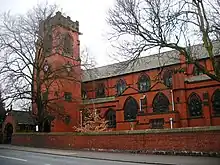 St Thomas's Church was built in 1840 but was replaced in the early-20th century by a new church on the old site. The church is built of Accrington brick with Runcorn red sandstone facings, it was designed by J. S. Crowther. A mission church dedicated to All Saints was built on Manchester Road and consecrated on 29 October 1938 by the Bishop of Manchester.[16]