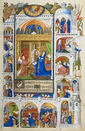 The manuscript was produced over several stages, including new material that was added as the manuscript passed from owner to owner.[2] The origins of the manuscript are not known with certainty, nor is there agreement on its initial patron. The inclusion of certain heraldic symbols in its decorative programme may suggest an original patronage in the French royal family, perhaps the dauphin, Louis of Guyenne (d. 1415).[3][4] Or this first stage in production might have taken place later, after Louis's death, the heraldic symbols having no immediate reference to patronage, but simply being part of the standard iconographic programme of the workshop.[4][5]