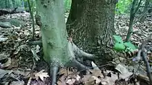 The canopy is dominated by American beech and sugar maple trees, providing little light to the understory. The reduced light provides poor conditions for shrubs, with the exceptions of American witch-hazel and alderleaf viburnum shrubs.[4] The ground cover includes herbs and spring ephemerals, flowers which are able to bloom before the canopy fills in.[5] Seedlings of beech and maple trees are shade-tolerant, allowing them to grow in low light conditions for several years. These seedling are waiting for an opening in the canopy, and grow rapidly when an opening is made by the death of a mature tree.[4]