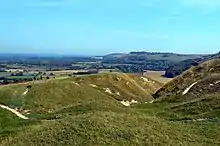 The other two areas are both on the north slope of Beeding Hill. The western area (area two) includes the Lynchet Triangle (TQ 207 098), which has medieval ‘cultivation terraces’ which were strips of open fields cultivated until the middle of the nineteenth century. In 2008 there was yellow rattle, three orchid species, common and latticed heath moths and grizzled skipper butterfly as well as glowworms,[9] but the area is deteriorating and is in unfavourable condition, due to lack of grazing.[1]