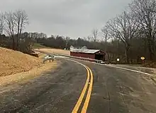 Located near the community of Barlow in Barlow Township, the bridge carries the gravel Bell Road over Falls Creek,[1]: 4 a southwestern tributary of Wolf Creek. Surrounded by woods,[2] the bridge lies adjacent to the farm once owned by the namesake Bell family, and the surrounding countryside is a mixture of forests and agricultural fields.[1]: 4 The builder was E.B. Henderson, who was responsible for four bridges in the area: the Blackwood Covered Bridge (1879), the Shinn Covered Bridge (1886), the Bell Covered Bridge (1888), and the Henry Covered Bridge (1894). Like two of the other three, the Bell is a multiple king post truss design, which became popular nationwide following its use on the National Road in a past version of the Y-bridge in Zanesville to the north.[1]: 3 An ordinary gable-roofed bridge with windows just below the roofline, the bridge spans 59 feet (18 m);[2] the deck is approximately 18 feet (5.5 m) wide, with 15 feet (4.6 m) of interior width, and the 11 feet (3.4 m) height permits slightly more than 9 feet (2.7 m) of interior clearance. It rests on abutments built of sandstone, quarried locally, while the roof is made of tin. The abutments are similar, with their faces underlying the bridge decks and wing walls to the side.[1]: 4
