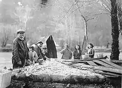 Nuxálk people gathered around an eulachon stink box near the Bella Coola River.