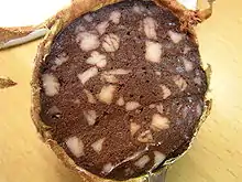 The name Beutelwurst comes from the fact that this does not come in a casing of intestine or a can, but in a linen or paper bag ("bag" = Beutel).[1] This bag is pressed for several weeks which gives the Beutelwurst a firm, light, dry consistency.