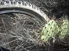 Metal studs may be embedded in the tread of knobby tires to improve traction on ice.[51] Inexpensive studded tires use steel studs, while pricier tires use more durable carbide studs.[52] A studded, knobby tread that zips onto a smoother, non-studded tire has been developed to ease the transition between the two types of tires.[53][54][55]