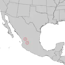 The range is highly localised, confined to two small areas of the southern Sierra Madre Occidental – the Sierra de Morones in southern Zacatecas, and La Muralla in Durango. It occurs at moderate altitudes, from 1800–2400 m and 21° North latitude, in warm and temperate, dry climate conditions.
