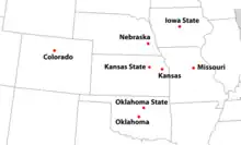 Big 12 ConferenceUniversity of ColoradoBig 12 ConferenceOklahoma State UniversityBig 12 ConferenceUniversity of OklahomaGrinnell CollegeBig 12 ConferenceKansas State UniversityBig 12 ConferenceIowa State UniversityDrake UniversityBig 12 ConferenceUniversity of NebraskaBig 12 ConferenceUniversity of MissouriBig 12 ConferenceUniversity of KansasWashington University in St. LouisUniversity of Iowa