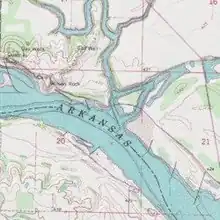Big Skin Bayou, also known as Skin Bayou or Big Skin Creek, is a tributary of the Arkansas River[1] located in Sequoyah County, Oklahoma. It takes its name from the word "skein" which are loose, tangled layers of yarn. A large, colorful canebrake resembling yarn; formed a near impenetrable, natural wall near the mouth of the creek before it was cleared for farming. French trappers and explorers named several of the major tributaries of the Arkansas River in Oklahoma; as it was once a part of the French Territory of Louisiana that was later the Louisiana Purchase. At one time, there were large rock bluffs near Big Skin's confluence with the Arkansas (most of these bluffs were later destroyed to provide rock fill for the W.D. Mayo Lock and Dam). The bluff on the south side (LeFLore County side) of the river and across from Big Skin's confluence was known as Swallow Rock, named for the birds that nested there and was the site of the old Fort Coffee. The bluff on the north side of the river (Sequoyah County side) and west of Big Skin is known as Wilson Rock (on some maps listed as Wilson's Rock). Both bluffs formed a natural wharf and served as historic steamboat landings and ferry crossings. The cemetery at Wilson Rock contains the graves of local residents as well as some travelers that fell victim to the river over the years. Tiana, the wife of the famed Texan Sam Houston was buried at Wilson Rock Cemetery for several years until she was moved to a cemetery near Fort Gibson. Wilson Rock and Big Skin Bayou were also drop off points for several groups of Cherokees that were forced to relocate to that part of Oklahoma/Indian Territory on the Trail of Tears. The relocated tribesmen that disembarked here would then follow the creek into the interior parts of Skin Bayou District where they settled. Most of eastern Sequoyah County was included in the "Skin Bayou District" of Cherokee Nation, Indian Territory; which also took its name from the creek.